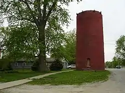 The Ransom Water Tower is located atop a hill, what was the highest point in the then-center of town. Upon its construction, a 40 foot brick tower was topped with a 28-foot-tall (8.5 m) wooden water tank. The brick tower is a round, "barrel", tower. At its base it has a diameter of 29 feet 4 inches which tapers as the tower rises to a diameter of about 24 feet.[2]