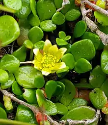 Ranunculus acaulis, in Australia and New Zealand called dune buttercup, sand buttercup or shore buttercup, is a yellow-flowered, small, fleshy herb, that grows in mats in damp places mostly near the sea. It occurs naturally in Australia, New Zealand, Chile and the Falklands. It flowers between August and April and sets seed from September till July. [2][3]