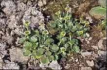 Ranunculus pinguis is a dark green, fleshy-leaved buttercup with relatively large, short-stalked flowers and narrow stiff yellow petals that grows in tufts. It is an endemic species of New Zealand on the Auckland and Campbell Islands that flowers from December to January and sets seeds between February and April.[4][5]
