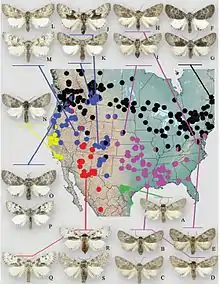Geographic distribution and phenotypic variation of Raphia frater subspecies: green – subsp. piazzi; pink – subsp. abrupta; black – subsp. frater; blue – subsp. coloradensis; yellow – subsp. cinderella. Multi-coloured circles indicate transitional populations and/or phenotypically intermediate specimens between respective subspecies. a R. f. piazzi; b R. f. abrupta; c R. f. abrupta; d R. f. abrupta; e R. f. abrupta; f, g R. f. frater; h R. f. abrupta – frater intermediate i R. f. abrupta – frater – coloradensis intermediate from highly variable population in Cherry Co., NE; j R. f. coloradensis; k R. f. coloradensis; l R. f. coloradensis; m R. f. coloradensis; n R. f. cinderella; o, p R. f. coloradensis – frater intermediates; q R. f. elbea; r R. f. elbea; s R. f. elbea. All specimens are males.[1]