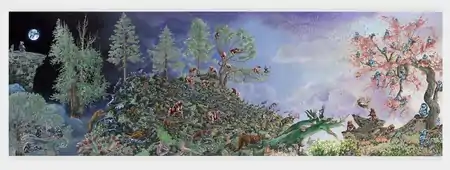 Raqib Shaw (born 1974) is an Indian-born, London-based artist.[1] He is known for his opulent and intricately detailed paintings of imagined paradises, inlaid with vibrantly coloured jewels and enamel.[2][3] His paintings and sculptures evoke the work of Old Masters such as Holbein and Bosch, whilst drawing on multifarious sources, from mythology and religion to poetry, literature, art history, textiles and decorative arts from both eastern and western traditions, all infused with the artist's imagination.[1][4]: 9