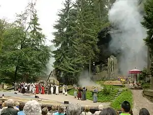 The Rathen Open Air Stage (German: Felsenbühne Rathen) is a natural stage in Saxon Switzerland in East Germany. It is located in a hollow at the upper end of the Wehlgrund valley between the rocks of Kleine Gans and Großer Wehrturm below the famous Bastei rocks and Neurathen Castle. The entrance to the hollow branches off just above the valley's junction with the Amselgrund.