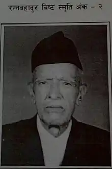 Sir Ratna Bahadur Bista (1910 - 1990) was the fifth Chief Justice of Nepal. He was born in Dadeldhura to an aristocratic family that was given land grants in Sudurpashchim Province circa 1911 during a hunting trip by King George V of the United Kingdom and Chandra Shumsher Jang Bahadur Rana, the Prime Minister of the Rana Dynasty.[1] He went on to become the 5th Chief Justice of Nepal, in office from 26 July 1970 to 6 August 1976.[2][3][4] He was appointed by the then-king of Nepal, Mahendra. He was responsible for the Summary Procedure Act 1971. The Committee that he established recommended for the establishment of High Courts in different regions which resulted in the creation of a four tiered judicial structure with one additional tier in the middle- "the Regional Courts."[3]