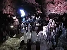 Prior to 2016, it was freely open to the public, but it closed late that year due to concerns with garbage accumulation, damage to the cave, and the cost of rescuing visitors.[7] Nearly all of the fragile lava straws had been destroyed by visitors.[8] The cave reopened in mid-2017 after a renovation in which walking decks and lighting was added to the part of the cave nearest the opening, and the removal of several metric tons of trash.[1] The infrastructure improvements were constructed in a way so as not to damage the cave. After the renovation, the cave can only be visited by guided tour.[1]