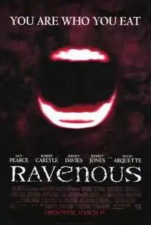 Ravenous is a 1999 horror Western cannibal film directed by Antonia Bird and starring Guy Pearce, Robert Carlyle, Jeffrey Jones and David Arquette.[3] The film revolves around cannibalism in 1840s California and some elements bear similarities to the story of the Donner Party and that of Alferd Packer. Screenwriter Ted Griffin lists Packer's story, as recounted in a couple of paragraphs of Dashiell Hammett's The Thin Man, as one of his inspirations for Carlyle's character.
