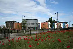 A number of pieces of public art have been installed: "Formation" by Rick Kirby at the entrance, designed to commemorate the areas links with aviation; "Handstanding" by Martin Heron near the school; "Green Wind 2" by Diane Maclean as a focal point beyond the end of Downham Boulevard on the Tump; and "Propeller" by Harry Gray has been placed adjacent to the green.[1]
