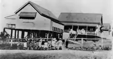 Ravenswood's economy received a boost in the mid-1880s by the arrival of the Great Northern railway in 1884 and the use of improved means to extract gold from ore. A new generation of public buildings began to replace those from the early days of the field, including a police station and courthouse, post office and hospital. In 1889, the school reached its peak enrolment of almost 400 children. It was extended according to standard plans and by 1905 had 8 classrooms and a gymnasium. Ravenswood enjoyed a boom between 1900 and 1908 as more modern techniques were applied to ore processing. However, the cost of extraction and continued exploration rose as returns fell and after the end of the First World War it became apparent that the field would not pick up again. In the 1920s buildings as well as people moved away from Ravenswood and were relocated to other towns. In 1929 enrolment in the school fell to below 100 and in 1930, Ravenswood became the first town in Queensland to lose its rail connection.[1]