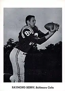 Berry was drafted by the Baltimore Colts in the 20th round as the 203rd overall pick of the 1954 NFL Draft. Considered a long-shot to make the team roster, [2] he was used sparingly as a rookie, catching only 13 passes. By his second NFL season he became a permanent starter when the Colts acquired quarterback Johnny Unitas. Over the next 12 seasons together the two became one of the most dominant passing and catching duos in NFL history.[2][7][3] Berry, who did not miss a single game until his eighth year in the league, led the NFL in receptions and receiving yards three times and in receiving touchdowns twice.[8]