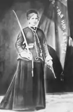Rayna Popgeorgieva Futekova (Bulgarian: Райна Попгеоргиева Футекова), better known as Rayna (aka Raika) Knyaginya (Райна Княгиня), aka "Queen of the Bulgarians" (Panagyurishte, Ottoman Empire, 6 January 1856 OS – Sofia, Kingdom of Bulgaria, 29 July 1917) was a Bulgarian teacher and revolutionary born in Panagyurishte who is famous for having sewn the flag of the April Uprising of 1876.[1][2]