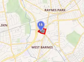 Raynes Park High School is situated at the junction of the Kingston bypass (A3) and Bushey Road (A298). To the east, it is bounded by West Barnes Lane (B282), and just east of the boundary between the boroughs of Kingston upon Thames (New Malden) and Merton, and just north of the Shannon Corner junction of the A3/B282.