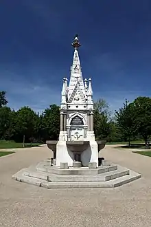 The Readymoney Drinking Fountain, also occasionally known as the Parsee Fountain, is a Grade II listed structure near the middle of the Broad Walk footpath on the east side of Regent's Park, in London. It lies southeast of London Zoo, close to the highest point of Regent's Park, about 41 metres (135 ft) above sea level, in an area with few trees, making it widely visible across the park.