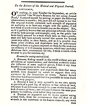 It was referred to in September of that year in the Medical and Physical Journal, with an adverse response by a writer under the pseudonym Φúσεως 'Aиóλoudoς. The writer listed their own 16 "Reasons for eating Animal Food."[7] Among their reasons were culinary purposes, that animals were created for consumption in accordance with parts of the Holy Bible, and "that a carnivorous animal is no more sensible that he is committing an act of cruelty while he is devouring another, than a sheep is in eating turnips."[8]