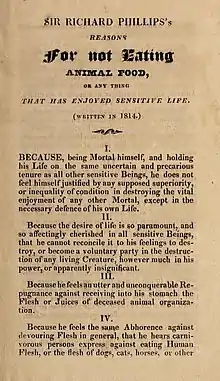 Sir Richard Phillips was an English teacher, author, publisher, Sheriff of London, and a vegetarianism activist.[1] At the age of twelve, he accidentally witnessed the barbarities of a London slaughterhouse, and while attending the Chiswick School he saw a fish being cut open, which contained the remains of smaller fish in the intestine. It was then brought to the table and served to eat. His appetite was "revolted at the idea of eating part of a creature so lately and so palpably enjoying itself in its own element," so he excused himself from the table, and in that moment, he chose he would maintain a rigid abstinence from meat eating. He often referred to it as the vegetable diet, or the Pythagorean diet.[2][3]