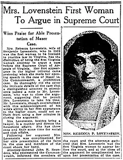 Rebecca Pearl Lovenstein (1907–1967) was one of the first two women to pass the written bar exam in the state of Virginia in 1920.