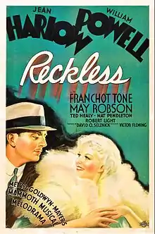 Reckless (also known as Born Reckless and Hard to Handle) is a 1935 American musical film directed by Victor Fleming and starring Jean Harlow, William Powell, Franchot Tone, and May Robson. David O. Selznick wrote the story, using the pseudonym Oliver Jeffries, basing it loosely on the scandal of the 1931 marriage between torch singer Libby Holman and tobacco heir Zachary Smith Reynolds, and his death by a gunshot wound to the head.[2]