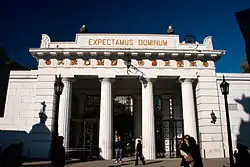 Set in 5.5 hectares (14 acres),[3] the site contains 4691 vaults, all above ground, of which 94 have been declared National Historical Monuments by the Argentine government and are protected by the state.[4] The entrance to the cemetery is through neo-classical gates with tall Doric columns.[12] The cemetery contains many elaborate marble mausoleums, decorated with statues, in a wide variety of architectural styles such as Art Deco, Art Nouveau, Baroque, and Neo-Gothic,[13] and most materials used between 1880 and 1930 in the construction of tombs were imported from Paris and Milan.[14] The entire cemetery is laid out in sections like city blocks, with wide tree-lined main walkways branching into sidewalks filled with mausoleums. These mausoleums are still being used by rich families in Argentina that have their own vault and keep their deceased there. While many of the mausoleums are in fine shape and well-maintained, others have fallen into disrepair.[15] Several can be found with broken glass and littered with rubbish. Among many memorials are works by notable Argentine sculptors, Lola Mora and Luis Perlotti for instance.[16] The tomb of Liliana Crociati de Szaszak, due to its unusual design, is of special interest.