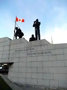 The work, entitled Reconciliation, depicts three peacekeeping soldiers — two men and a woman — standing on two ridges of stone which cut through the broken debris of war and converge at a high point, which symbolizes the resolution which peacekeeping brings. The base of the monument includes Lester Pearson's 1956 quote "We need action not only to end the fighting but to make the peace... My own government would be glad to recommend Canadian participation in such a United Nations force, a truly international peace and police force", as well as the French translation.[1]