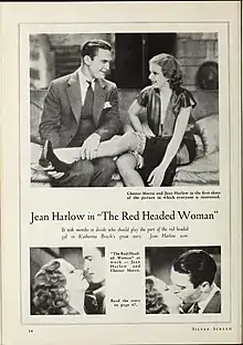 Before casting Harlow, MGM considered casting Clara Bow as Lillian Andrews, who originally agreed to take the part but objected to the "future services" option demanded by the studio.[4] Screenland (June 1932) (pg.60) also noted that Colleen Moore was considered for the part. In its April 12, 1932 issues, however, Motion Picture magazine (pg.11) reported seeing Jean Harlow at the premiere of the film Grand Hotel sporting red, "titian hair", suggesting she was involved in the production. The "Modern Screen" gossip column in The Hollywood Times confirmed these suspicions in May 1932 stating: "Guess who is going to be MGM's 'Red-Headed Woman'? No other than that famous platinum blonde, Jean Harlow. They will either have to get a new title for the picture, or a very large bottle of very extra red henna for Jean's crowning glory." The opening scene of the film shows Harlow's character getting her hair dyed red. The film's first line of dialogue is "So Gentlemen Prefer Blondes. Hah." The film, in fact, was Jean Harlow's first film after having left Hollywood for a few months following a fall-out with Howard Hughes, as reported by Screenland.[5]