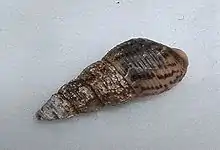 The red-rimmed melania, scientific name Melanoides tuberculata,[3][4] is a species of freshwater snail with an operculum, a parthenogenetic, aquatic gastropod mollusk in the family Thiaridae.