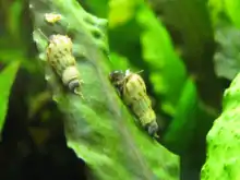 Red-rimmed melania females are both parthenogenic and ovoviparous.[6][28] Females can be recognized by their greenish coloured gonads while males have reddish gonads. Under good conditions, females will produce fertilised eggs that are transferred to a brood pouch where they remain until they hatch (parthenogenesis and viviparity).[23] Melanoides tuberculata has 1–64 embryos in its brood pouch.[28] Snails will begin reproducing at a size as small as 5 millimetres (1⁄4 in)[28] or 10 millimetres (3⁄8 in) in length and broods may contain over seventy offspring (iteroparity).[5] The size of the shell of the parent at peak release of juveniles is 20.0 millimetres (3⁄4 in).[28] The size of juveniles at birth is 1.2–2.2 millimetres (3⁄64–11⁄128 in).[28]