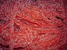 The European Union approves Allura Red AC as a food colorant, but EU countries' local laws banning food colorants are preserved.[5] In the United States, Allura Red AC is approved by the FDA for use in cosmetics, drugs, and food. When prepared as a lake it is disclosed as Red 40 Lake or Red 40 Aluminum Lake. It is used in some tattoo inks and is used in many products, such as cotton candy, soft drinks, cherry flavored products, children's medications, and dairy products. It is occasionally used to dye medicinal pills, such as the antihistamine fexofenadine, for purely aesthetic reasons.[6] It is by far the most commonly used red dye in the United States, completely replacing amaranth (Red 2) and also replacing erythrosine (Red 3) in most applications due to the negative health effects of those two dyes.