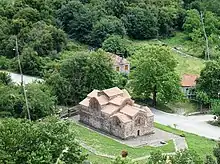 It was founded as the katholikon of a monastery by the brothers John and Theodore Tzimiskes, who held the rank of protostrator.[1] The church was originally dedicated to the birth of the Theotokos, but became known as the "Red Church" due to the colour of its masonry. Historically, it was also known as "Panagia of Vella" (Παναγία Βελλάς), as it was a metochi of the Vella Monastery, and as "Royal Monastery" (Βασιλομονάστηρο), due to its importance.[1]