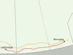 In Saskatchewan, Highway 13 is designated as Red Coat Trail. The travel corridor from the Manitoba–Saskatchewan border to Winnipeg follows Manitoba PTH 2.[nb 1][1]