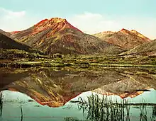 The Red Mountain Mining District lies from the divide northward to Ironton Park, halfway down towards Ouray. It was the site of a historic silver boom from 1882 until 1893, including the Yankee Girl and National Belle. Head frames of the old workings are still visible from the highway, as are the remains of the three largest communities: Red Mountain Town, Ironton, and Guston.[2][3] The sprawling Idarado Mine (Treasury Tunnel) continued digging until the 1970s, and reclamation of tailings is ongoing.