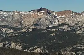 Red Peak is an 11,699-foot-elevation (3,566 meter) mountain summit located in the Sierra Nevada mountain range, in Madera County of northern California, United States.[3] It is situated in Yosemite National Park, approximately 10.5 miles (16.9 km) southeast of Yosemite Valley, 1.5 mile (2.4 km) south-southeast of Gray Peak, and 1.5 mile (2.4 km) northwest of Merced Peak, the nearest higher neighbor. Red Peak is the second-highest peak in the Clark Range, which is a subset of the Sierra Nevada.[1] This geographical feature's brilliant color is caused by iron-bearing minerals weathered to an iron rust which colors the granite.[4]