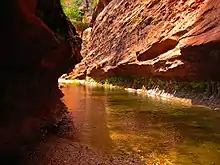 The wilderness is predominantly wind and water sculpted pinnacles, windows, arches, and slot canyons, and the red-rock cliffs of the Mogollon Rim that mark the edge of the Colorado Plateau. Bordered on the east by Sycamore Canyon Wilderness, the high mesas of Secret Mountain and Wilson Mountain jut out into the lower country and canyons as deep as 1,500 feet (457 m) drain into Oak Creek and the Verde River.[1]