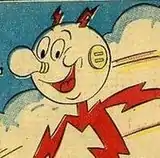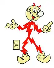 Reddy Kilowatt is drawn as a stick figure whose body, limbs, and hair are made of stylized lightning-bolts and whose bulbous head has a light bulb for a nose and wall outlets for ears.[1]