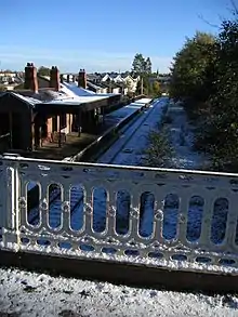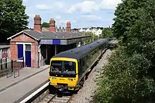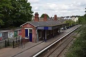 Facilities at the station are minimal – there are a few chairs and timetable information is provided. Help points, giving next train information, were installed in 2010. There is no ticket office or self-service ticket machines.[6] The Victorian-era station building is only original station building left on the line,[7] decorated with a mural painted by local students,[8] it is used as an upholsterer's showroom rather than for railway purposes.[9] Access is step-free from South Road, through an area containing residents' garages. The platform backs onto the gardens on the south side of the road.[6]
