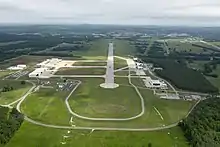 In 1943, the airstrip on Huntsville Arsenal was established to assist with the testing of incendiary bomb clusters. The testing was done during the height of World War II and, after the allied victory, was promptly stopped. The airfield was largely vacated, though it continued to serve as a military landing strip.[3]