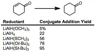 Reductions of α,β-unsaturated carbonyl compounds may occur in a 1,2 sense (direct addition) or a 1,4 sense (conjugate addition). The tendency to add in a 1,4 sense is correlated with the softness of the hydride reagent according to Pearson's hard-soft acid-base theory.[7] Experimental results agree with the theory—softer hydride reagents afford higher yields of the conjugate reduction product.[8]