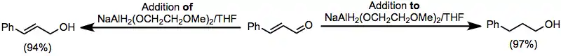 Unsaturated carbonyl compounds may be reduced either to saturated or unsaturated alcohols by alkoxyaluminium hydride reagents. Addition of an unsaturated aldehyde to a solution of Red-Al afforded the saturated alcohol; inverse addition yielded the unsaturated alcohol product.[25]