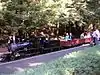 800 now-mature redwood trees were planted when the railroad was initially laid out.[7] In 1968, the railroad was re-gauged to 15 in (381 mm) in.[8] The new 15" gauge, 5" scale equipment allowed two adults to ride side by side and is representative of American narrow gauge railroads.[9] Two of Redwood Valley's locomotives have made trips to England, run on several English 15 in gauge railways, including the Ravenglass and Eskdale.[9][10] After Thomsen died in 1995, his daughter Ellen assumed operations of the Redwood Valley Railway.
