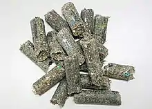 Materials such as glass and metals are removed during the treatment processing since they are non-combustible. The metal is removed using a magnet and the glass using mechanical screening. After that, an air knife is used to separate the light materials from the heavy ones. The light materials have higher calorific value and they create the final RDF. The heavy materials will usually continue to a landfill. The residual material can be sold in its processed form (depending on the process treatment) as a plain mixture or it may be compressed into pellet fuel, bricks or logs and used for other purposes either stand-alone or in a recursive recycling process.[4] RDF or SRF is the combustible sub-fraction of municipal solid waste and other similar solid waste, produced using a mix of mechanical and/or biological treatment methods such as biodrying.[5] in mechanical-biological treatment (MBT) plants.[3] During the production of RDF / SRF in MBT plants there are solid loses of otherwise combustible material,[6] which generates a debate whether the production and use of RDF / SRF is resource efficient or not over traditional one-step combustion of residual MSW in incineration (Energy from waste) plants.[7]