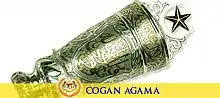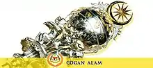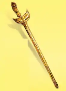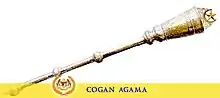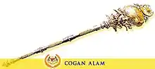 The Cogan Alam ("Sceptre of the Universe") is part of the Royal Regalia. This silver ceremonial mace symbolises power and is 162.66 cm long. It consists of an orb mounted on a long shaft. The orb is topped by a crescent and an eleven-pointed gold star. Around the equator of the orb, the crests of the eleven Peninsular Malaysian states are embossed in gold. The orb is supported by four tigers while the shaft itself is decorated with six padi stalks in gold.