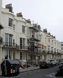 These 12 houses, arranged along the sea-facing north side in the form of two wings flanking a four-house centrepiece, are the focal point of the square, forming "a kind of palace front" topped with a pediment displaying Regency Square in prominent black lettering.[14][6] Pevsner described this feature as "not [being] enough of an accent to pull the square together".[55] The terrace is a five-part composition: the end "wings" (formed by numbers 26–27 and 36–37) are of four storeys, stuccoed and with tall parapets pinched upwards to form small pediments; the central section (numbers 30–33), also of four storeys and built in yellow brick, and topped with the inscribed pediment; and numbers 28–29 and 34–35, rising to three storeys and forming a link between the central and outer sections.[14][6][45] Numbers 30–33 have a two-window range, rather than the single window on each of the other houses, and have four pilasters running the full height of the façade and terminating at the parapet in circular antefixae.[6][45] The entrance porches are of the Ionic order. Each house has a canopied cast-iron balcony at first-floor level. There is rusticated decoration at ground-floor level.[45]