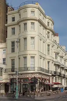 The former St Albans House was designed in 1828 by Amon Henry Wilds alone and was fitted out by William Izard.[24][35] A shopfront was fitted in the early 20th century,[42] and the ground floor has housed a restaurant since 1930.[56] Contemporary with the shopfront was the round-headed entrance on the King's Road elevation, with an archway supported on fluted columns, a dentil-patterned cornice and ornamentation including scrollwork and a panel inscribed St Albans.[42] The building has five storeys, three windows facing King's Road and the sea, and a five-window range to Regency Square. It is stuccoed and slate-roofed. The shopfront is topped by a thin cast-iron balcony. The right-hand (east) side of the King's Road façade has a full-height tripartite segmental bay window with architraves to each window. The Regency Square elevation also has a three-light full-height bay window; all other windows are blocked.[42]