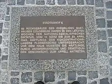 This abstract work of Flossenbürg granite and limestone is located in a free space (combination mini-park and bicycle parking lot) opposite the Colosseum, but offset by approximately 70 meters on the other side of the street.[upper-alpha 21] The carved inscription avoids naming or specifying the exact location of the former Colosseum subcamp.[18] It is worded as follows: