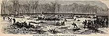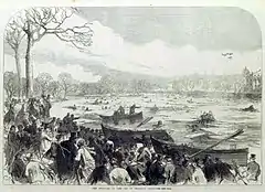 Overnight, the ice refroze and the following day, about 500 people took to the ice with an estimated 2,000 more watching. At 3:30 pm the ice was heard to crack and almost half of the skaters fell into the water. As many could not swim and were wearing heavy clothing, they sank.[1] Those watching attempted to rescue them by launching boats and pulling branches from trees to use as lifelines.[2] Many were rescued unharmed, while survivors with hypothermia and recovered bodies were taken to the nearby Marylebone workhouse.[3] Recovery of all the bodies took several days as the lake kept refreezing and several bodies had to be removed from the bottom of the lake by divers.[4]