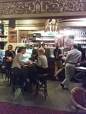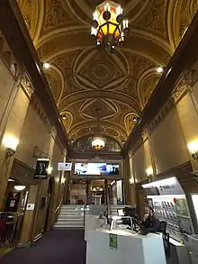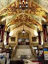 The dominant feature of the entrance hall is its high barrel-vaulted ceiling decorated with Neo-classical Empire-style plasterwork and murals. The decorative pattern consists of raised, geometric shapes and festoons painted bronze, set on a pale background and divided by strips of fretwork. The end vaults are painted with colourful medieval scenes. Two elaborate original chandeliers, with red glass panels and faux candle lights are suspended from the centre of two ceiling medallions. There is an elaborate cornice and the walls resemble courses of travertine block work. Shallow pilasters divide the long walls, with a decorative frieze of small pointed arches running between them. Another frieze line sits further down the wall sections at door head height. Brass candelabras are attached to each pilaster in line with these lower friezes. Above the door openings at either end of the hall are fixed large billboards with ornamental plaster frames surmounted by crowns. The floor is carpeted and has a marble skirting, but the original patterned terrazzo floor, similar to that in the threshold space, is believed to survive beneath the carpet.[1]
