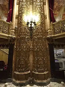 The grand foyer is an impressive single volume with richly ornamented walls and ceiling; predominantly Spanish Gothic with Baroque effects, such as the use of Rococo plasterwork and large mirrored surfaces. It is approximately 22 metres (72 ft) long, 12 metres (39 ft) wide and three-and-a-half storeys high. The doors leading from the entrance hall open into the western corner of the space. To the left stands a recent ticket and snacks counter which, along with various signage, is not considered to be of cultural heritage significance. Centrally placed along the south-eastern wall, and leading up to a mezzanine level, is the grand marble staircase. On either side of it, at ground level, are double doors that lead into spaces outside of the heritage boundary.[1]