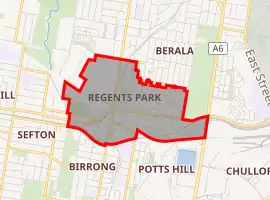 - Australian Bureau of Statistics (27 June 2017). "Regents Park (NSW) (State Suburb)". 2016 Census QuickStats. Retrieved 19 March 2018.