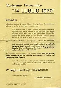 The Reggio revolt occurred in Reggio Calabria, Italy, from July 1970 to February 1971. The cause of the protests was a government decision to make Catanzaro, not Reggio, regional capital of Calabria.[1][2] The nomination of a regional capital was the result of a decentralization programme of the Italian government, under which 15 governmental regions were concretized and given their own administrative councils and a measure of local autonomy.[3]