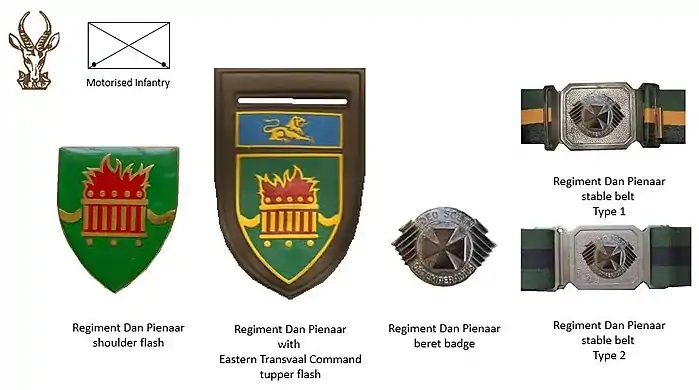 Regiment Dan Pienaar was an infantry battalion of the South African Army. As a reserve force unit, it had a status roughly equivalent to that of a British Army Reserve or United States Army National Guard unit.