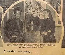 Gray had a studio on Leeson Street in the early 1950s. There he made a wash drawing of the artist Patrick Swift which he used as a base for a large canvas homage to the painter some years later.[6] Gray's first paid work was a commission by University College Dublin to design the setting and costumes for their production of The King's Threshold by W.B. Yeats. The lead in the play was given to the young actor-poet John Jordan. During the preparations and rehearsals Gray painted a portrait of Jordan which now hangs in the collection of The Dublin Writers Museum. At this point the artist Cecil Ffrench Salkeld ARHA (Associate of the Royal Hibernian Academy) took an interest in Gray, and gave him a room in his Dublin home where Gray studied old master techniques. Salkeld was visited by writers, painters and musicians, such as Brian O'Nolan, Arland Ussher, Francis Stuart, Marten Cumberland and John Beckett, cousin of Samuel. Gray painted John Beckett during this period and the portrait now hangs in St. Columba's College, Dublin, where Beckett had his first music lessons. Gray became a close friend of Brendan Behan and was asked to be best man at Behan's wedding.[2][7] Gray designed many settings for The Pike Theatre[8] including the production of The Rose Tattoo[9] by Tennessee Williams. After the success in Dublin, the play was transferred to The Grand Opera House, Belfast and Gray travelled there to redesign and create the much larger settings need for the bigger stage. Look Back in Anger by John Osborne was at the same time running at the Opera House and Gray befriended and sketched the leading actress Jocelyn Britton. Later he designed the sets for Nekrassov[10] by Jean-Paul Sartre which was mounted at The Gate Theatre. Gray later went on a tour of Ireland with The Dublin Repertory Theatre Company designing their productions, including The Wood of the Whispering by M. J. Molloy.