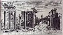 Moving north from the Arch of Septimius Severus, the region contained the collective Imperial Fora, a series of monumental public squares. They were four in number, the Forums of Caesar, Augustus, Nerva and Trajan. The Forum of Caesar contained the Temple of Venus Genetrix, with an equestrian statue of Julius Caesar standing in front of the temple.[5] The Forum of Augustus contained the Temple of Mars Ultor, while the Forum of Nerva contained the Temple of Minerva. The Forum of Trajan, which apart from the still standing Column of Trajan which dominated the open space, also contained an equestrian statue of Trajan, while the buildings contained an enormous library. Around the open space stood the statues of the great philosophers, poets and rhetoricians, which continued to be added to. In the fifth century, statues of Claudian and Sidonius Apollinaris were included in the Forum of Trajan.[6]