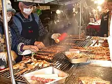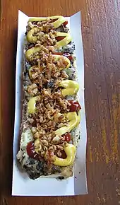 The most popular and well-known street food in Japan is takoyaki, consisting of fried batter filled with octopus, onions, ginger, and tempura pieces. Traditionally, it is cooked in an iron pan with round holes to create the shape of a takoyaki and it comes in a shape of a ball with fish shaving and sauce. This dish originated from Osaka.[31] The custom of street food is not to eat in the streets because of tradition. It is more acceptable to eat sitting under a roof, at home, or designated eating area.[32]